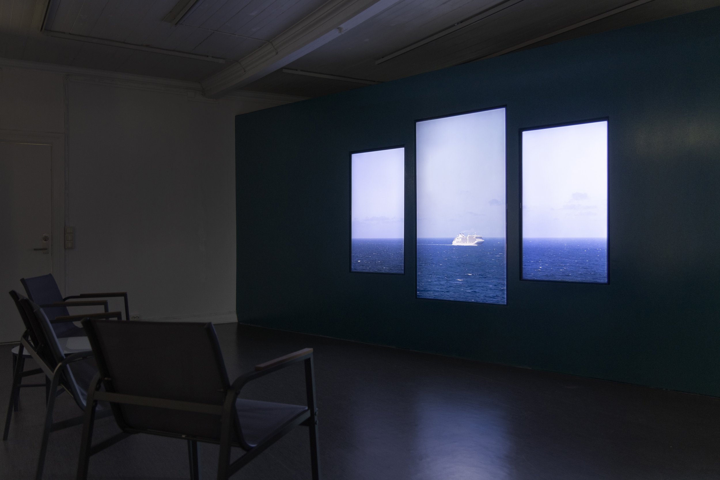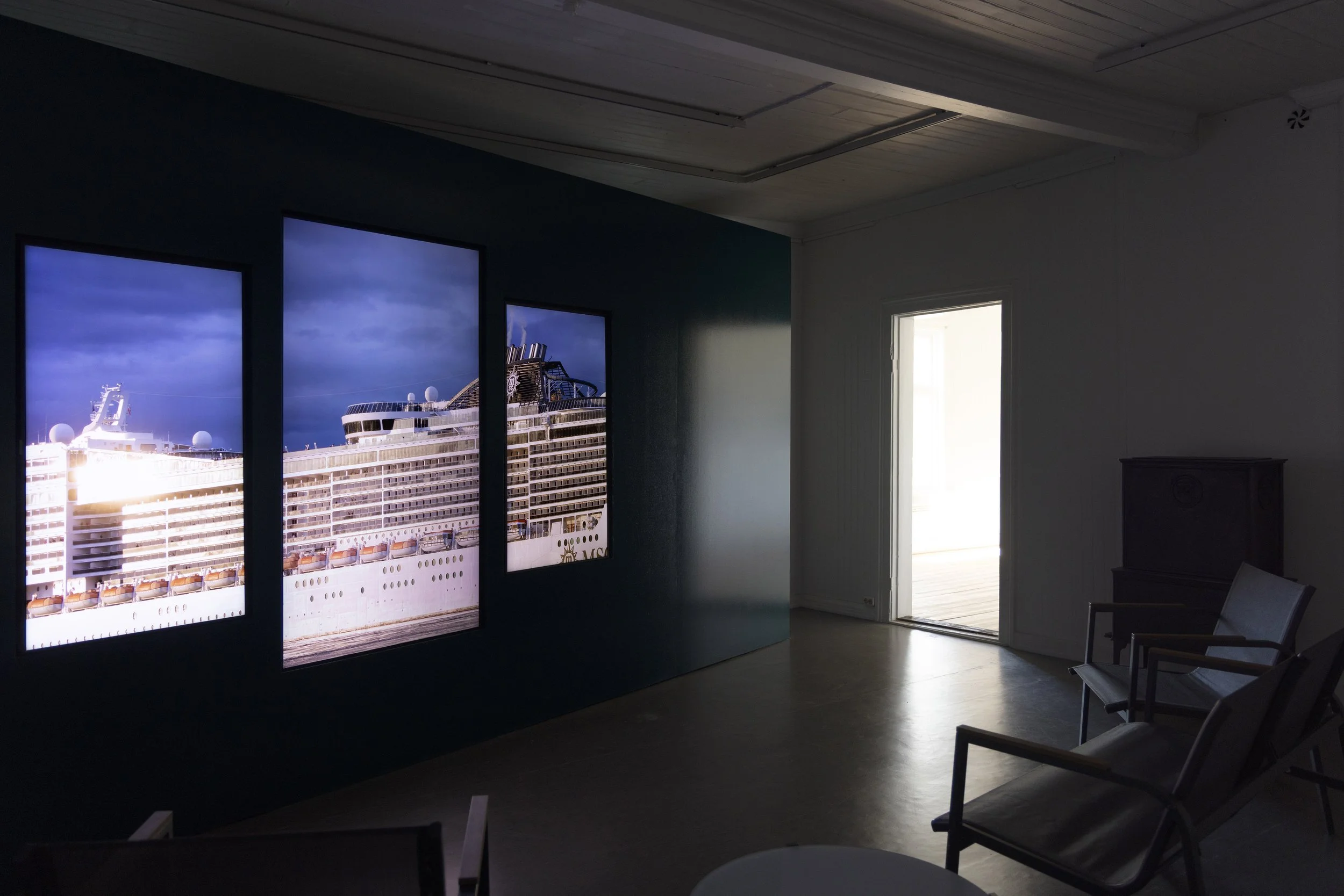 Three-channel video installation, 42 minutes, UHD video without sound. Recessed wall-mounted LED screens. Seating area with outdoor furniture, inspired by the furniture found on cruise ship balconies.